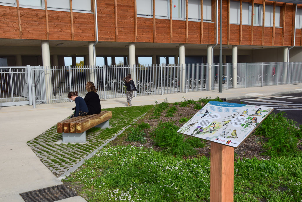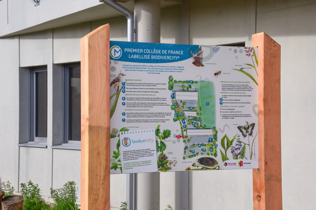 Tout a été pensé pour les performances environnementales du collège : utilisation de la topographie naturelle, orientation, préservation d'une zone humide, géothermie, production d'énergie solaire, matériaux durables et biosourcés ... Chaque espace est également optimisé pour la biodiversité : toitures végétalisées, plantes grimpantes, limitation de l'imperméabilisation du sol, plantations d'essences locales, prairies fleuries, installation de gîtes pour la faune (nichoirs, bois mort ...). Ces aménagements ont été récompensés par l'obtention du label BiodiverCity® Construction, une première pour un collège en France !