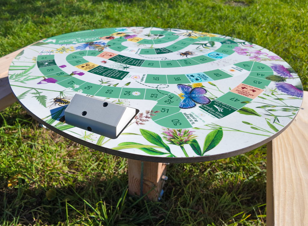 - D'un plateau de jeu en Stratimage®, matériau écologique et très résistant pour l'extérieur (résistant aux UV, lessivable en cas de tags, solide). Un dé à tourner est intégré dans le plateau (plastique stable aux UV en impression 3D). Un poteau en bois Douglas d'origine Occitanie et monté en entaille sur une platine en acier galvanisé à chaud sert de pied à la table (dimensions 120x120x650 mm).